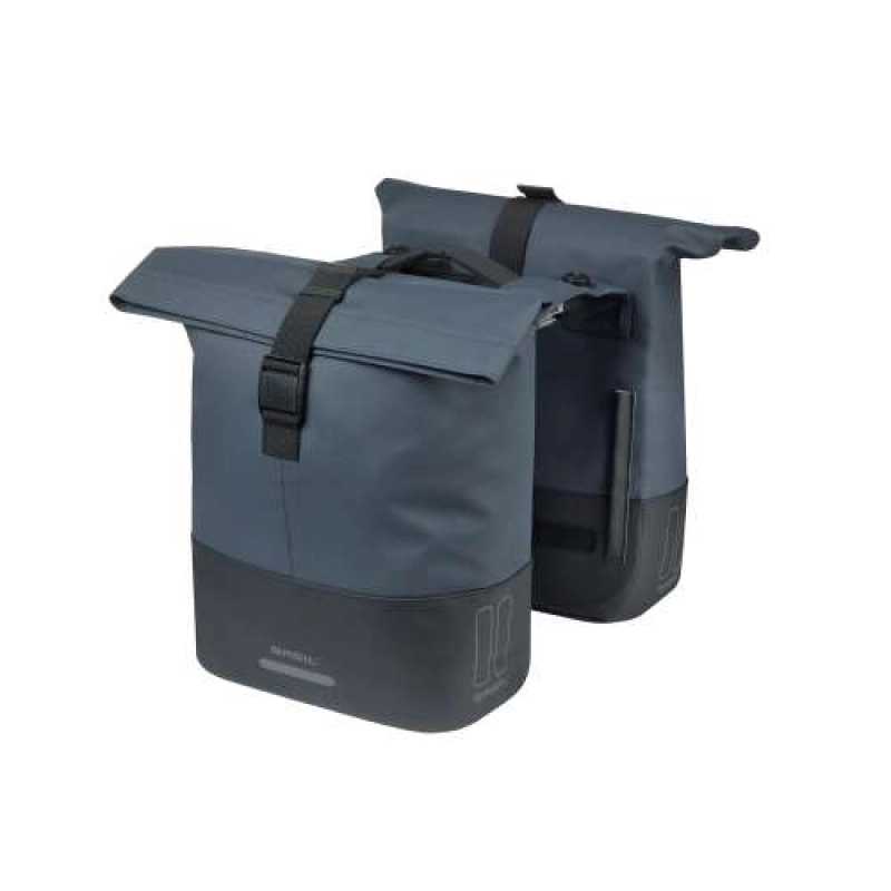 Dubbele tas BASIL "Cove MIK 2.0". Inhoud: 28-32 liter, afmetingen: (L x B x H) 29 x 14,5 x 36 cm, gerecycled PET - veganistisch leer Incl. voorgemonteerde MIK adapterplaat 2.0 (70173), waterdichte vouwsluiting met gesp, compatibel met Basil afstandhouder, klittenbandsluiting, reflectie i.› zwart / marine