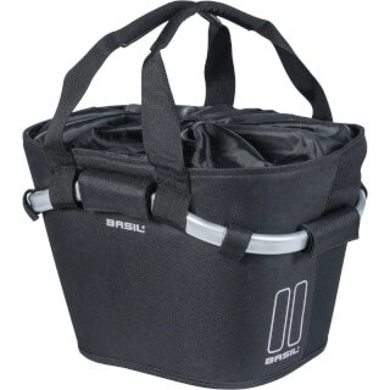 BASIL "fietsmand, voorop", mand om alles mee te nemen. Voorkant, inhoud: 15 liter, afmetingen (L x B x H): 28 x 37 x 25 cm, incl. Basil KF-plaat, geschikt voor houder, verwijderbaar Aluminium, houder niet inbegrepen, koordbevestiging, draagriem, binnenvak, reflecterende toepassingen i.› black