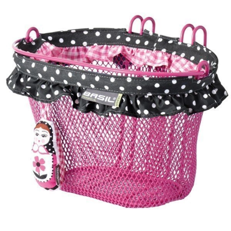 BASIL "kinder fietsmand, voorop" "Jasmin-Mand". Voorzijde, 12"-20", voor montage met dubbele stuurhaken, afneembaar Smal bemeten, ovaal, staal, met kleurrijke sierrand, met beugel i.› lichtroze, maten (L x B x H): 28 x 20 x 18 cm