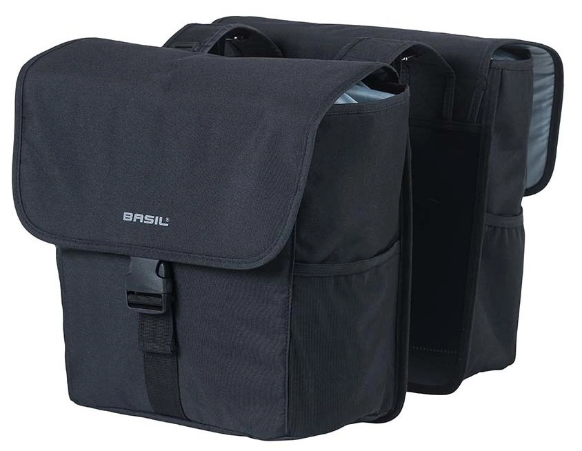 Onderdelen + Accessoires, Fiets ¦ BASIL dubbele tas "Go - Double" Volume: 32 l, maten (L x B x H): 33 x 16 x 38 cm Van hoogwaardig materiaal, hoofdvak met koordsluiting, twee zijvakken, met twee banden voor o.a. LED / kinderzitje / snelbinder / veerklem,