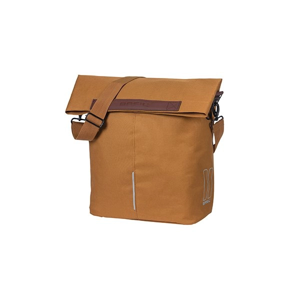 Polyester, vouwsluiting met magneet, binnenvak met ritssluiting, hengsel met vegan lederen details, afneembare schouderriem, bevestigingsmogelijkheid voor LED verlichting, reflecterende applicaties