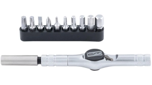 CONTEC multifunctie-gereedschap "TFR - Trident Ratchet". SB-pakketDopsleutel ratel met omkeerfunctie en drievoudige opname voor 1/4", magnetische opname, te gebruiken als T-tool door herpositionering, verlenging en Tas inbegrepen. Gemaakt van CrV gereedschapsstaal. 10 functies: - 2,5/3/4/5/6/8 mm binnenzeskantsleutel - Zespunt ster-profiel sleutels T25/T30 - Kruiskopschroevendraaier PH1 i.› zilver