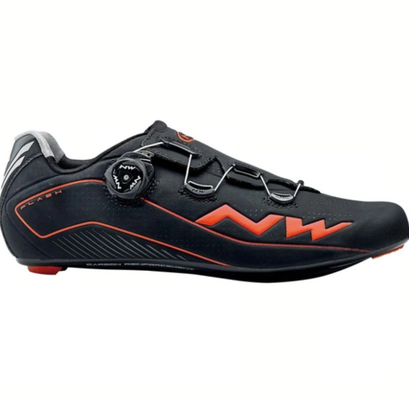 Northwave Flash Shoes Black / Lobster Orange. Comfortable, soft, light and aerodynamic road shoes made of Ultralight polyurethane with Biomap Aero Overlap construction which ensures a superb fit and ventilation. With S.L.W.2 micrometric closure and NRG Air sole with carbon reinforcements.
