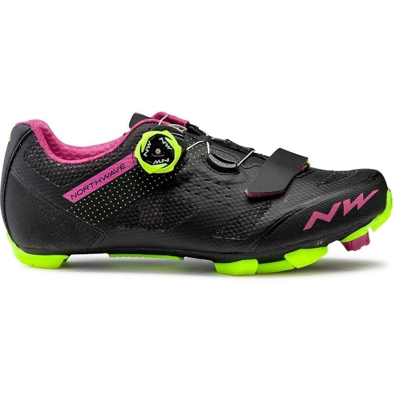 Deze stijlvolle Mountainbikeschoen is de Women Razer van het topmerk Northwave. De mountainbikeschoen is voorzien van een XC 10 zool met een stijfheidsindex van 10,0 en TPU-inzetstukken op strategische punten waardoor de mountainbikeschoen een hoge tractie heeft en uitstekende slijtvastheid. Verder heeft de mountainbikeschoen een unibody constructie met ultradunne versterkte materalen voor een ongeëvenaard ademend vermogen en een gerichte stabiliteit tijdens het fietsen. De TPU-verstevigingen op de teen en hiel zorgen voor extra bescherming en het Performance Regular voetbed biedt meer ondersteuning. De mountainbikeschoen heeft daarnaast een asymmetrische vetersluiting die de druk verwijdert van de bovenkant van de voet voor een optimale aansluitende pasvorm waarbij u met de SLW3-draaiknop plus extra riem de mountainbikeschoen op stapsgewijze manier strakker kunt maken of volledige ontgrendeling, en dat allemaal in één knop. Hierdoor heeft u met de Northwave Men Razer mountainbikeschoen altijd de optimale pasvorm. Tot slot maakt de mountainbikeschoen gebruik van een SPD bevestiging met twee schroefpunten voor eenvoudig in- en uitklikken onder alle omstandigheden.
